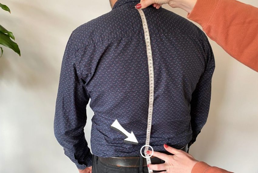 - Mesurez depuis la base du col jusqu’en bas du dos. Ajoutez environ 20 cm à cette première mesure pour obtenir une longueur adaptée à une veste de costume.