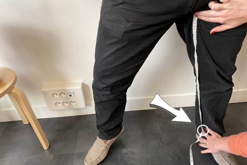 L’étape suivante consiste à mesurer l’entrejambe : partez du haut de l’intérieur du pantalon, à la jonction, et descendez jusqu’au bas, juste sous la cheville.