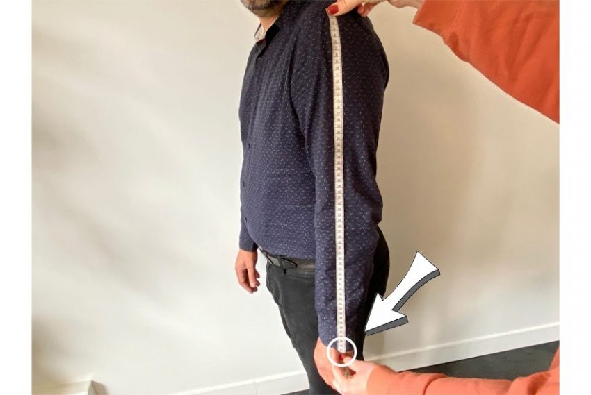 Placez le mètre au sommet de l’épaule et déroulez-le jusqu’au poignet. Arrêtez-vous là, inutile de dépasser. Cette longueur déterminera l’ajustement parfait des manches.