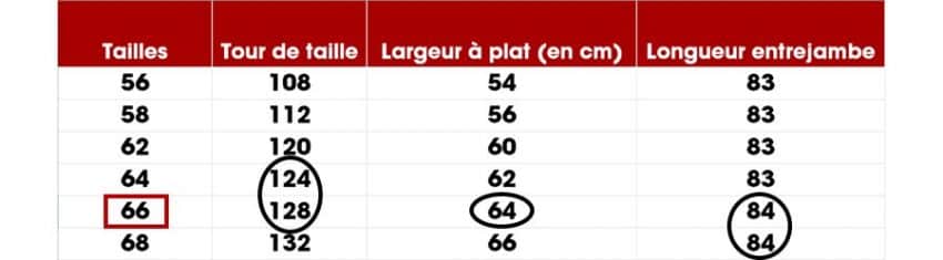 Prenons un autre cas : tour de taille de 126 cm, largeur à plat de 64 cm, longueur d’entrejambe de 84 cm. Comme pour les vestes, il est plus confortable de retenir le chiffre supérieur, ici 128 cm. Le choix final dépendra de votre préférence, coupe ajustée ou non. Selon le tableau, la taille de pantalon conseillée sera 66.