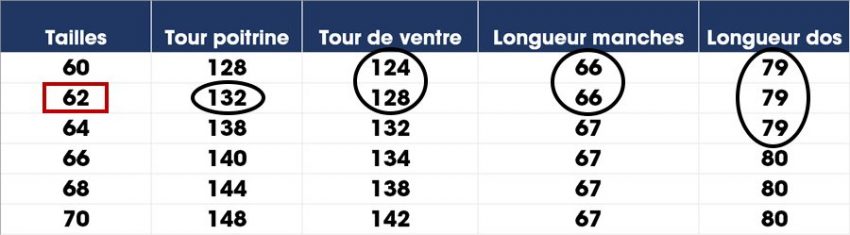 Imaginons que votre poitrine mesure 132 cm, votre tour de ventre 126 cm, la manche 66 cm et le dos 79 cm. Avec un tour de ventre à 126 cm, il vaut mieux viser la taille correspondant à 128 cm pour ne pas se sentir comprimé. En consultant le tableau, la taille de la veste à choisir serait alors 62.