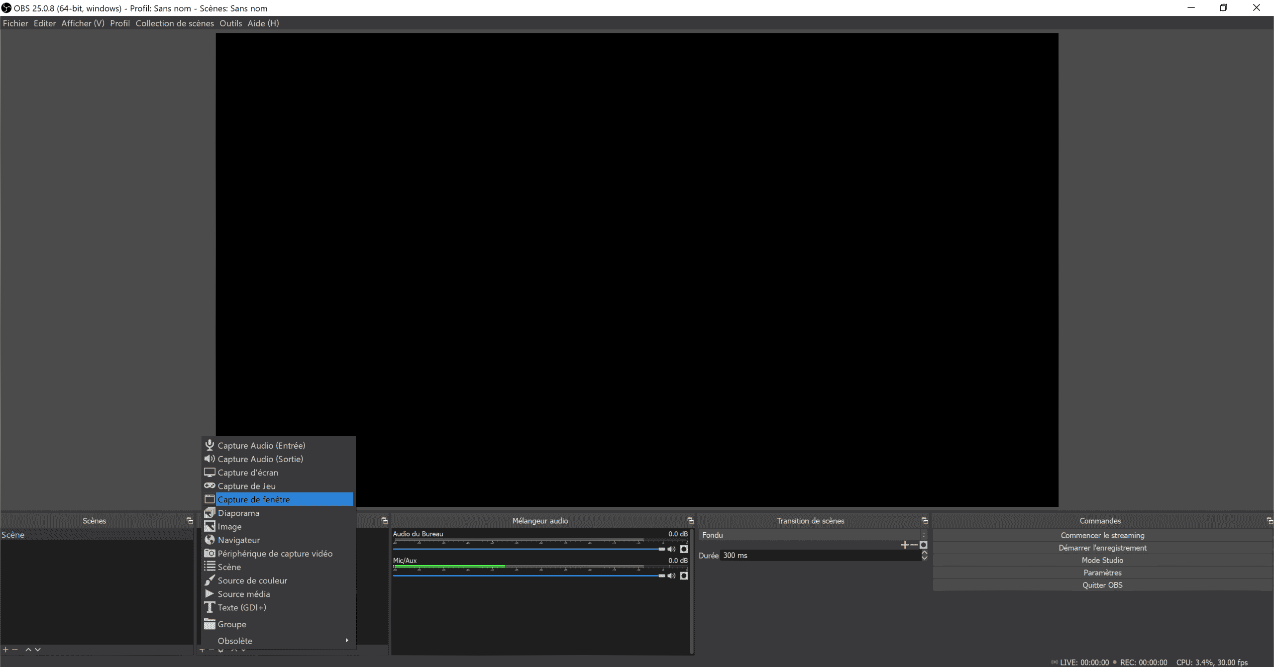 Une fois les paramètres définis, quittez le menu et passez à l’ajout d’une source. Cliquez sur le bouton dédié pour afficher toutes les options. Vous pouvez choisir entre l’enregistrement de tout l’écran (Capture d’écran) ou d’un logiciel précis (Capture de fenêtre).