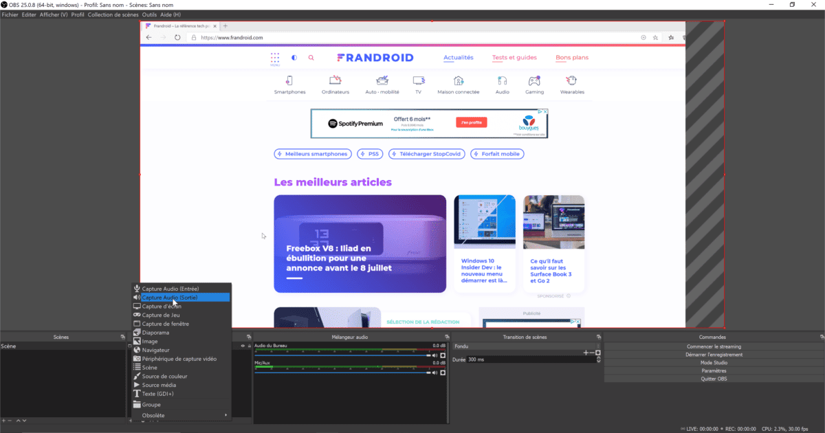 Dans l’aperçu, ajustez la taille de la fenêtre à votre convenance. Il est aussi possible d’ajouter une source audio. Voici les principales possibilités :