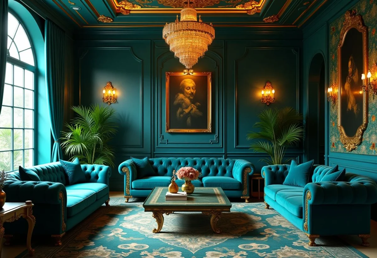 Pour un salon Art Déco, misez sur une palette de couleurs riches et sophistiquées. Le bleu profond et le vert forêt sont idéaux pour les murs, tandis que des accessoires dorés ou en laiton, comme des luminaires ou des cadres, ajouteront une touche de luxe. Le velours est un matériau de choix pour les meubles, apportant une texture douce et élégante.